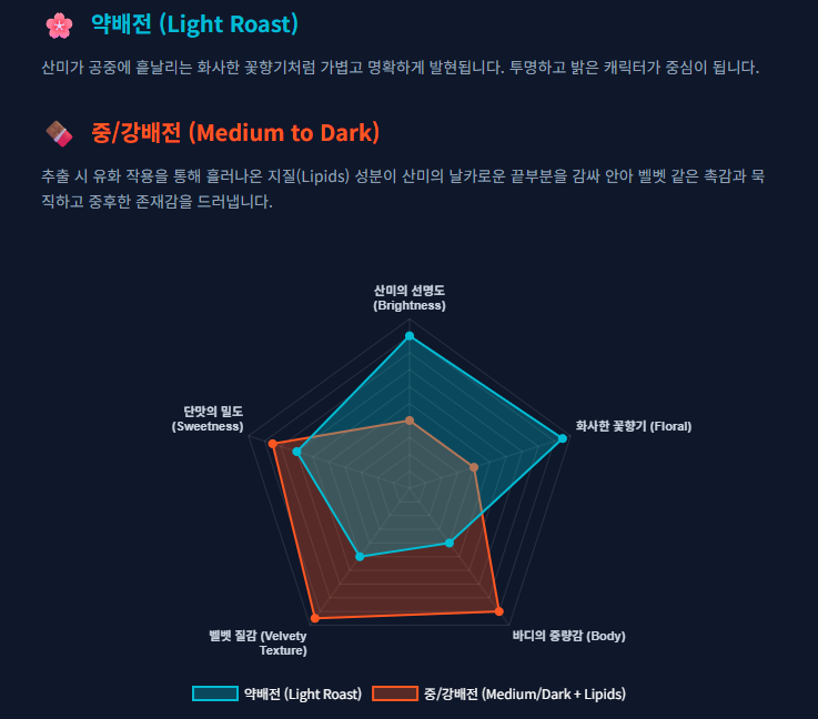 약배전에서 느껴지는 산미가 공중에 흩날리는 화사한 꽃향기라면, 중배전 이후의 산미는 지질(Lipids) 성분 및 잔류 당류와 결합하여 더욱 묵직하고 중후한 존재감을 드러냅니다.