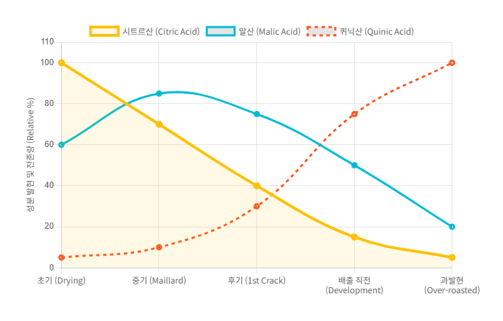 커피 생두 조직 내에는 시트르산(Citric Acid), 말산(Malic Acid), 퀴닉산(Quinic Acid) 등 수많은 유기산이 함유되어 있습니다. 이 성분들은 열에 매우 민감하여 로스팅이 진행됨에 따라 각각 상이한 분해 지점을 나타냅니다.